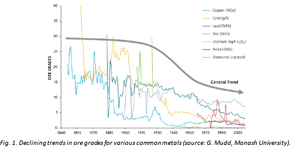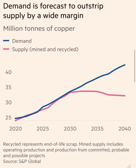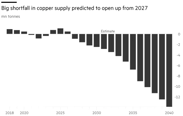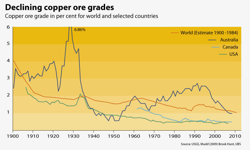 Global copper ore grades have fallen roughly 40-50% since 1990s, meaning miners have to dig up significantly more rock just to produce the same amount of refined copper.