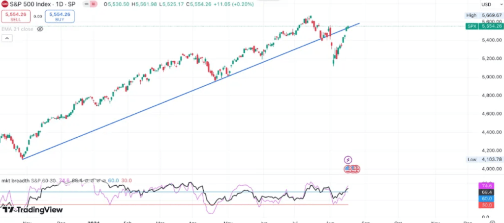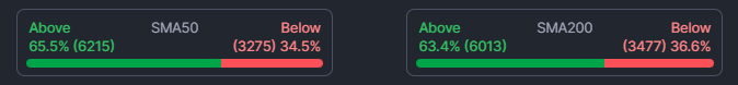 In this example, we can see that 65.5% of stocks in the S&P 500 are trading above their 50d SMA, indicating healthy momentum and breadth.