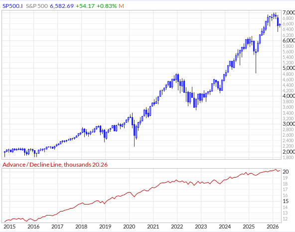 If the S&P 500 is rising, and the A/D line is rising, it is confirmation that the rally is strong and diversified.