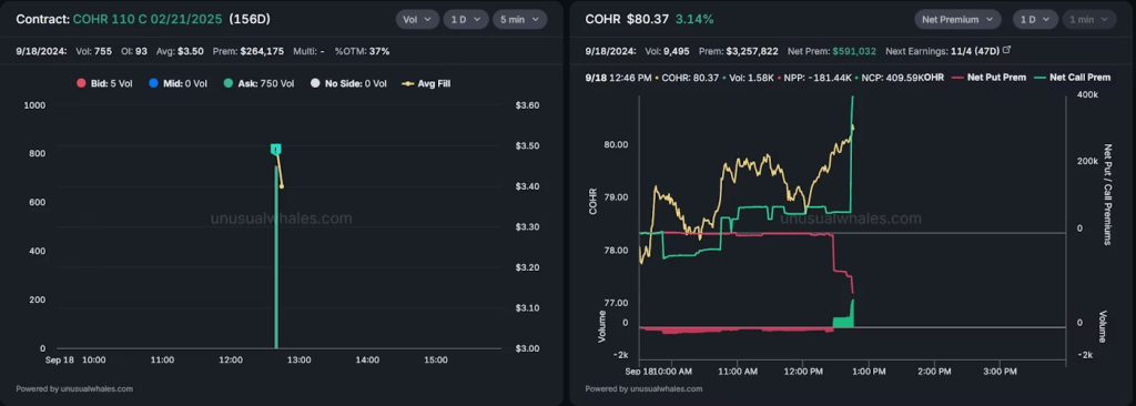 Next, we see a sizeable $264,175k call that is 37% OTM, 156 DTE. The net premium is $591,032, and we’d ideally like to see consistent bullish flow while we are tracking COHR. So far so good.