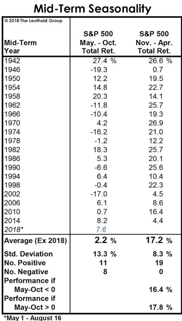 A high probability bet is to prepare for volatility before the midterms by allocating a higher % of cash, and redeploying that cash in the November – April post midterm period which has shown strong average returns of 17.2%.