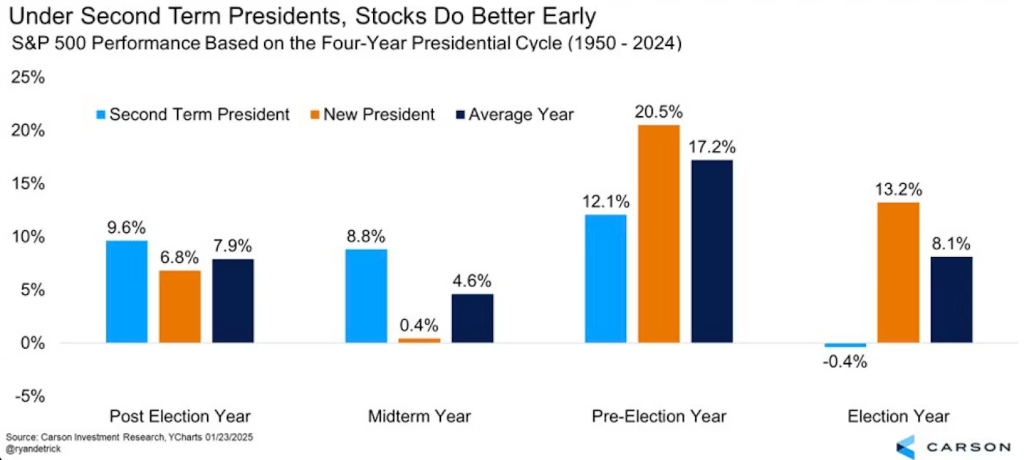 The presidential election cycle theory historically sees the mid-term election year as the weakest year due to increased volatility from political uncertainty.