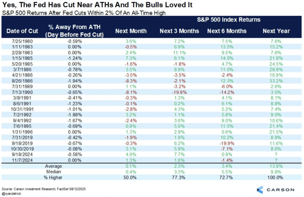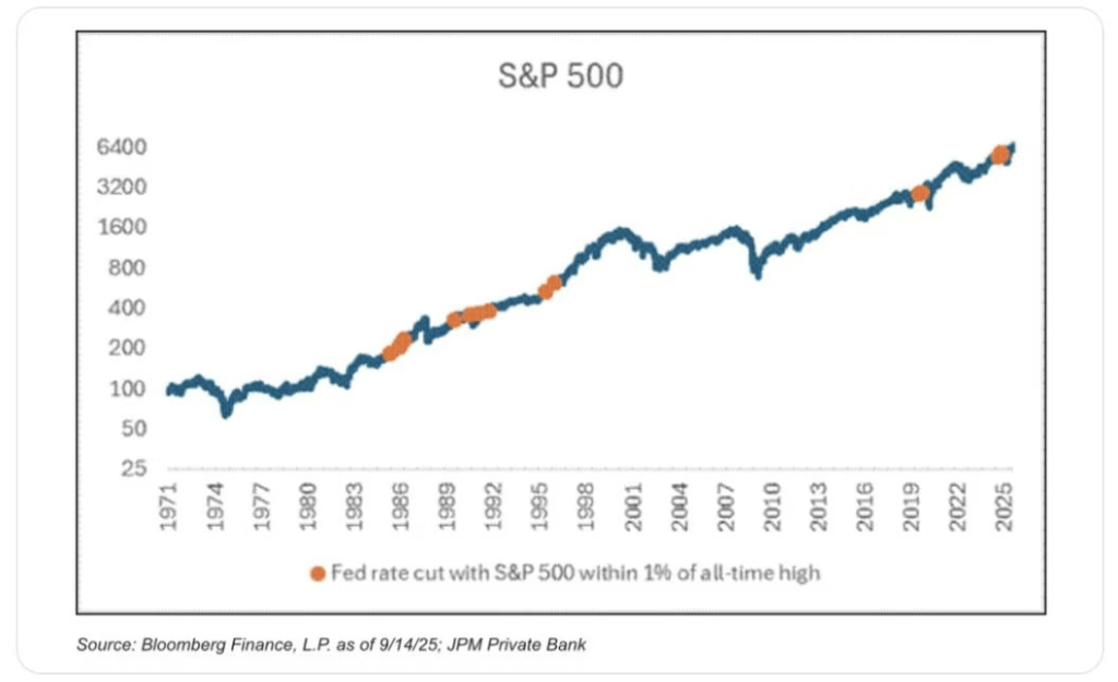 JPM’s study shows that whenever the Fed has cut rates within 1% of ATH of S&P 500, S&P 500 was up higher a year later every single time with an average return of 15%.