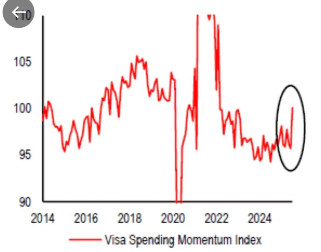 - Credit card delinquencies continue to decline while VISA consumer spending momentum index continues on an uptrend.