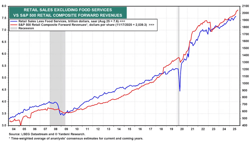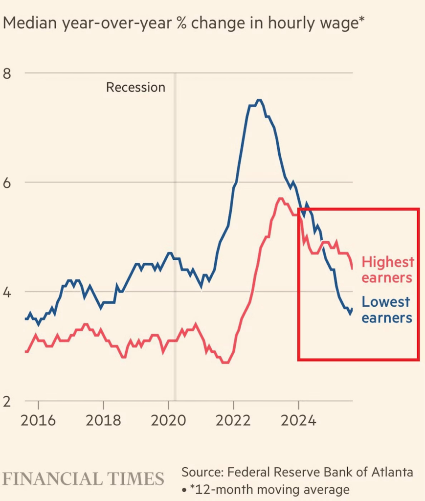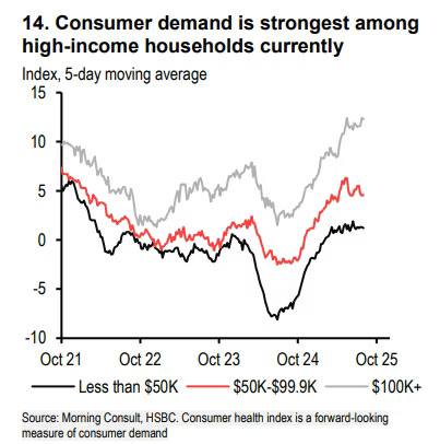 The higher income households continue to spend aggressively on services, propping up the broader economy and labor market. Meanwhile, lower household incomes are pulling back due to living cost struggles.