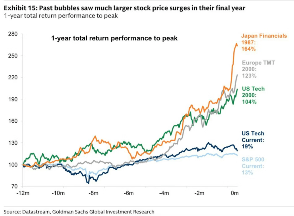 In addition, Goldman Sachs has shown that price action is typically parabolic in the final year of a bubble, which is certainly not the current case.