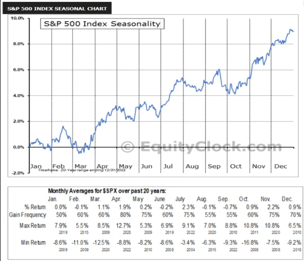 Seasonality is the historical trends or patterns that recur over a yearly timeframe. This seasonality chart shows the averages over a 20-year period.