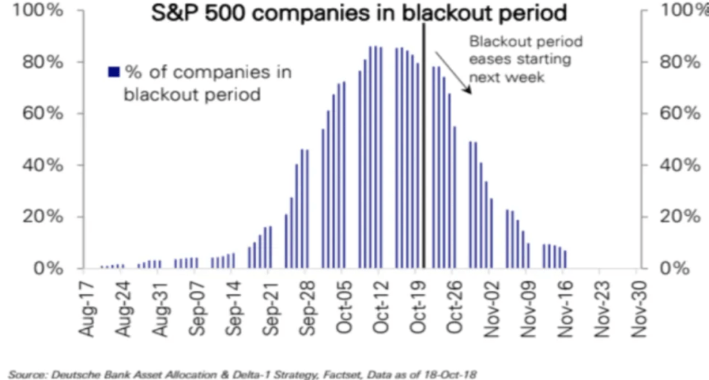 The corporate buyback blackout period is the timeframe where companies are not allowed to “buy back” their own shares. This occurs 4x a year, prior to companies’ quarterly earning reports.