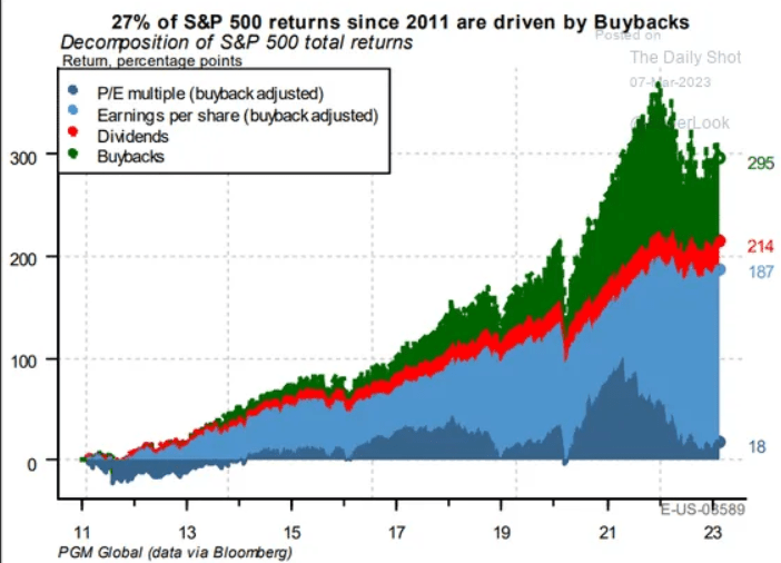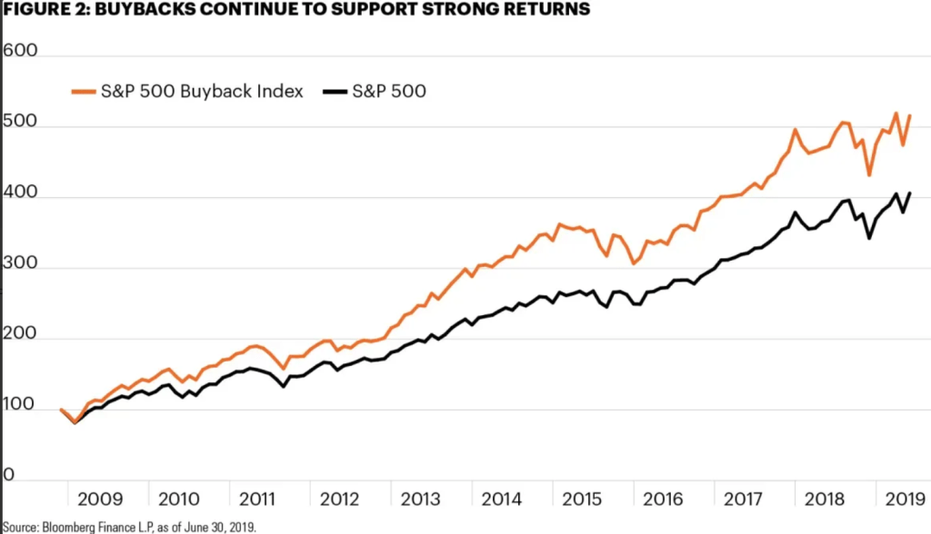 The SP500 Buyback Index, which tracks the top 100 stocks in the S&P 500 with the highest buyback ratios, significantly outperforms SP 500. The companies are acting as a massive buyer of its own stock, creating demand and thus liquidity in the market.
