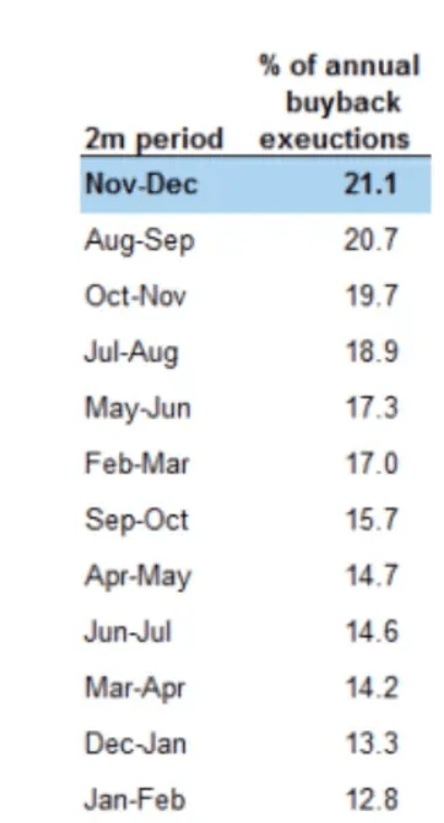 Corporate buybacks executed during Nov-Dec and Aug-Sep. In-line with the rally periods of Seasonality.