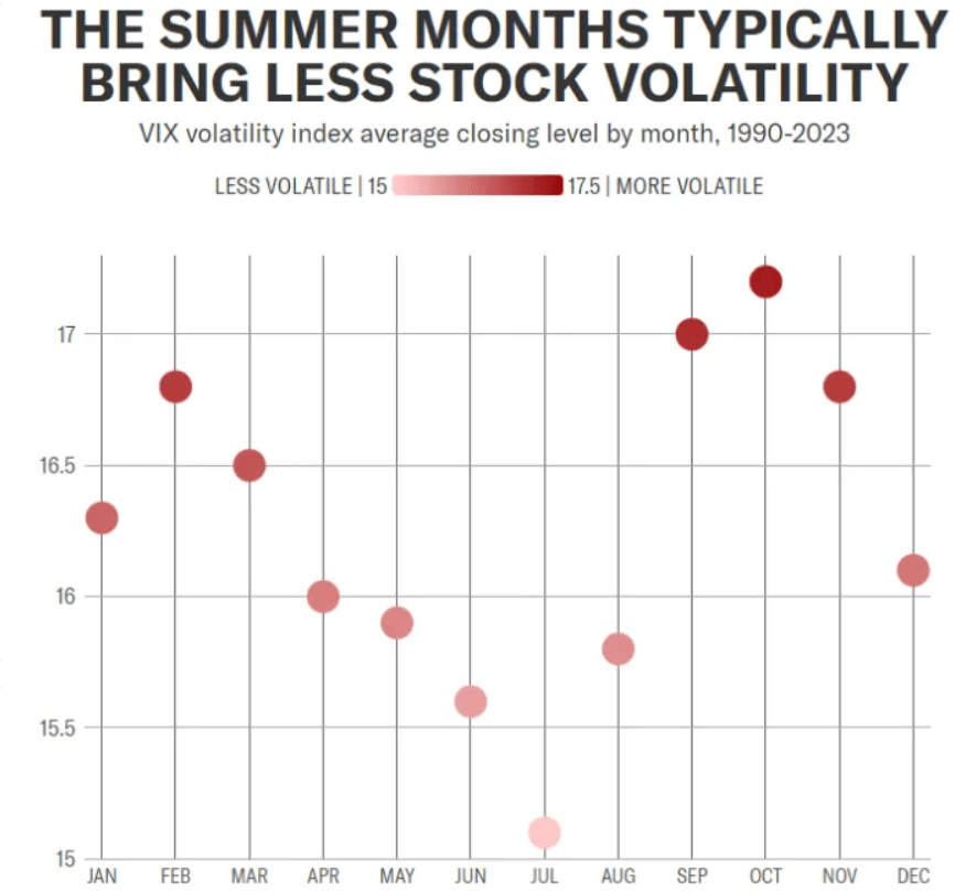 These are the average VIX levels for each month. July typically has the lowest volatility and best returns as traders go on break for summer vacation.