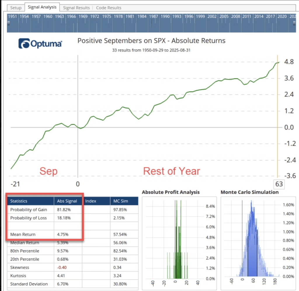 In months where September has a positive return, there is an 82% probability of a positive return throughout the rest of the year, with an average return of 5.3%.